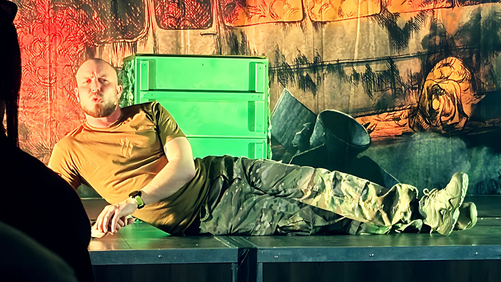 Вистава рясніє іронічними епізодами на межі відчаю. Один із них – про те, як під час боїв за Авдіївку комусь із бійців довелося «прикинутися» російським солдатом, аби вирватися з оточення. Сцена нагадує історію з поганим анекдотом: вишиванка змінюється на шапку-вушанку, а «Снова седая ночь» несподівано стає паролем до порятунку. І ти ловиш себе на думці: «Хіба це може бути правдою?» Виявляється, може.