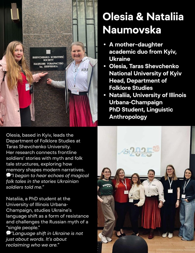Серед учасників – Олеся та Наталія Наумовські з Києва. Олеся очолює кафедру фольклористики в КНУ імені Тараса Шевченка в Києві, а її донька Наталія здобуває PhD зі спеціальності “лінгвістична антропологія” в Іллінойському університеті в Урбана-Шампейн. Олеся, яка досліджує як воєнні наративи переплітаються з фольклором, а її донька кидає виклик російському міфу про “єдиний народ”.