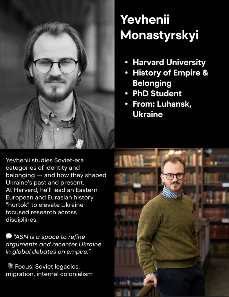 Євгеній Монастирський, аспірант університету Гарварду у Бостоні, родом із Луганська. Його дослідження стосуються спадщини СРСР, ідентичності, міграції та колоніалізму. У Гарварді він розповідає східноєвропейські та євразійські історії, щоб підняти дослідження, зосереджені на Україні у різних дисциплінах.