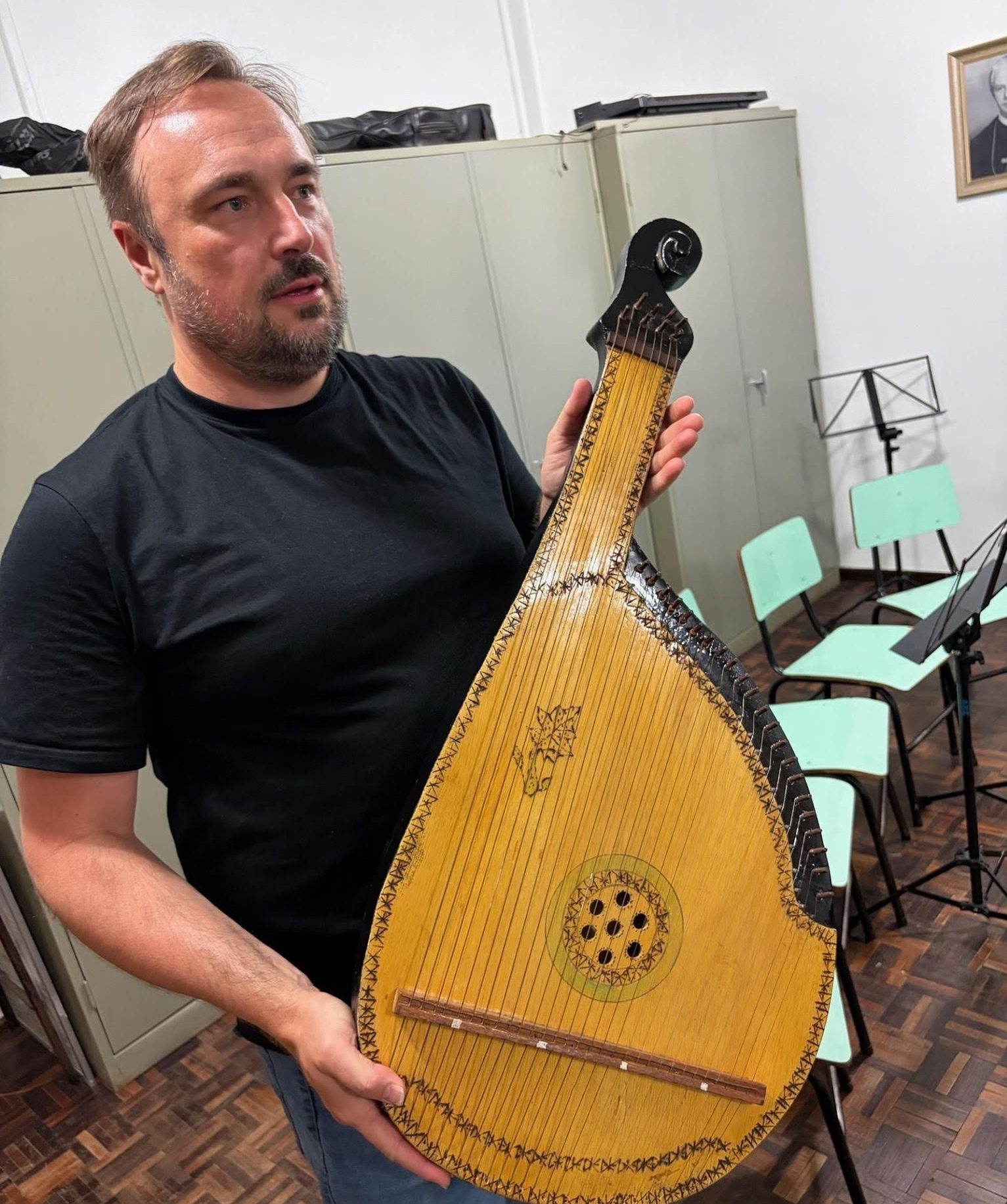 Почалися сюрпризи. Ми пройшли довгим коридором до репетиційної кімнати, де нам показали шафи, повні бандур, що лежали на полицях – я нарахував близько 30 штук. Усі вони належать інституту. На жаль, більшість із них не використовуються, деякі потребують серйозного ремонту, а більшість, ймовірно, потребують заміни струн. Незважаючи на добру волю та ентузіазм Даяни та Ізабель щодо бандури, привести всі інструменти до ладу, ймовірно, поза їхніми можливостями. Справді було б корисно, якби досвідчений бандурист з України чи іншої країни міг приїхати і провести там кілька тижнів, якщо не місяців, працюючи з бандурами та з Даяною, щоб дати поштовх для більш серйозного відродження мистецтва бандури в Прудентополісі. Вони також могли б бути корисними для Родріго в Куритібі.
