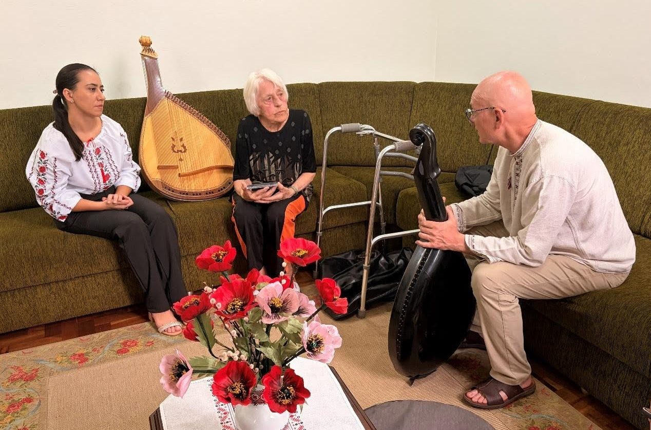 Ми (Даяна, моя дружина Сандра та її дві доньки, а також катехитка Олена Гардаш, яка живе і працює в Інституті) мали зворушливу зустріч – відвідали Ізабель, якій 89 років, і хоча їй доводиться користуватися ходунками, вона має сильний голос і чудово говорить старою галицькою українською. Нам було приємно слухати, як вона розповідала, як вона та Микола Чорний працювали над створенням бандурних шкіл у Куритібі та Прудентополісі. У неї дуже гарна львівська бандура, яка перебуває в хорошому стані. Ізабель сказала, що давно не грала на ній, але скоро почне (тож я налаштував її для неї). Я зіграв релігійний кант «Через поле широкеє», а потім ми всі разом співали «Чорна я си чорна» під акомпанемент бандури.