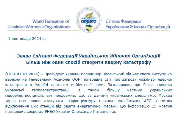 The World Federation of Ukrainian Women's Organizations (WFUWO) has appealed to the international community to warn of the threat of a nuclear catastrophe in Ukraine due to Russia's systematic attacks on energy infrastructure. The destruction of thermal and hydroelectric power plants has already put the country at risk of an energy crisis, and possible shelling near Ukrainian nuclear power plants could cause large-scale radioactive contamination. WFUWO calls on world leaders to take action to protect Ukraine's energy security, which is critical for Europe.