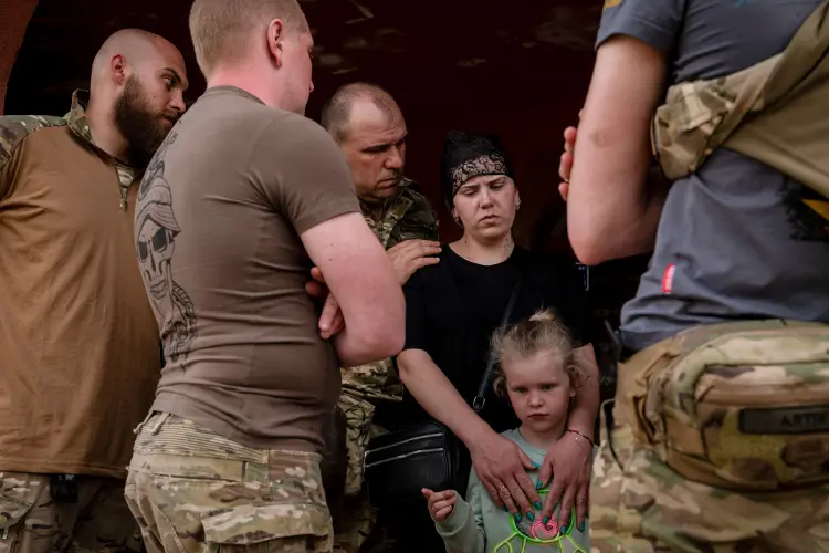 - A family tragedy in Trebukhiv. Ukrainian soldiers support Iryna Shargorodska and her daughter Sonia after the funeral of her husband and father, Sergeant Oleksandr Shargorodsky, on May 21.