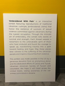 An interactive exhibition titled “Embroidered With Pain” is currently on display at the ArtReach Space within the Scottsdale Center for the Performing Arts in Arizona. The exhibition shares the stories of Ukrainian women who survived sexual violence committed by Russian occupiers during the war.