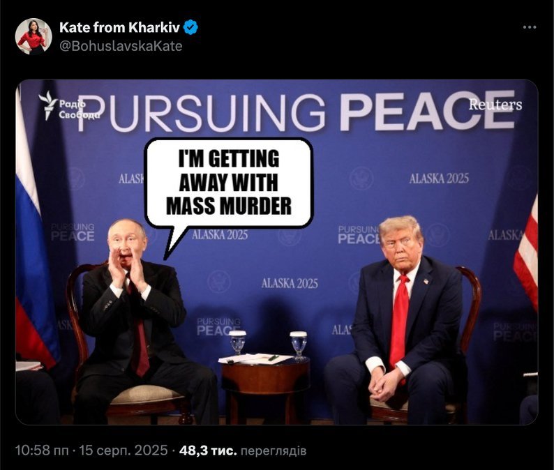 “This is what the absence of justice, dignity, and reason looks like. To shake hands with a man who killed around a million Ukrainians during military occupation and missile strikes – people who never wanted or started this war,” wrote writer and soldier Yaryna Chornohuz. x.com/blackstork22