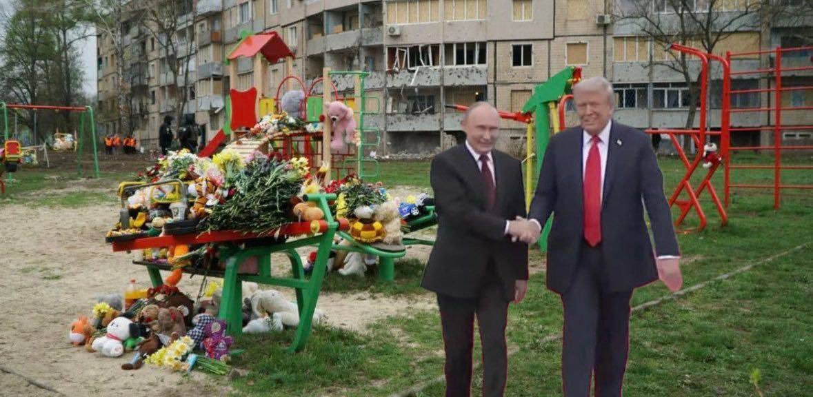 An image circulated online showing Putin and Trump shaking hands against the backdrop of a children’s playground in Kryvyi Rih, where a Russian ballistic missile struck on April 4.