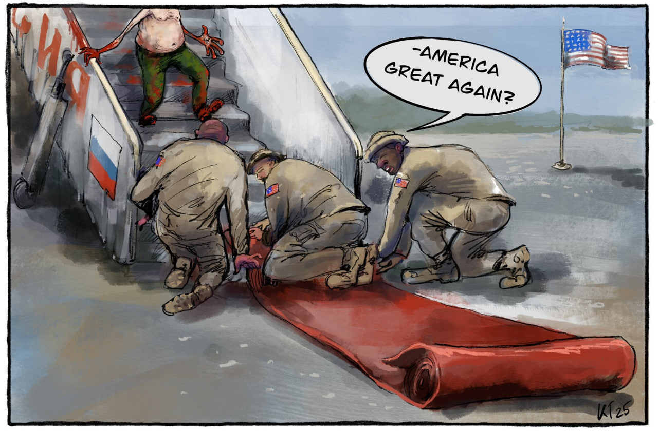 Reaction of Ukrainian Artists to the Trump–Putin talks in Alaska, where the Russian dictator was welcomed with a red carpet: