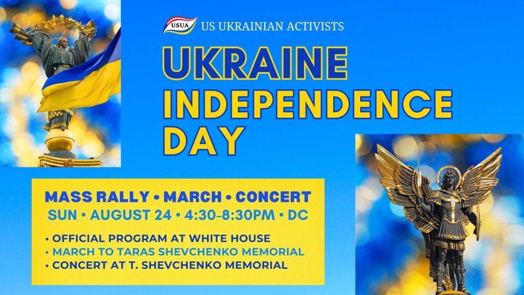 On August 24, a large-scale celebration organized by US Ukrainian Activists led by Nadia Shaporynska will take place in downtown Washington. The program will begin at 4:30 PM in front of the White House with a rally and speeches. After that, at 6:30 PM, participants will march with a giant Ukrainian flag to the Taras Shevchenko Monument, where a concert with music, poetry, and dance will take place from 7:30 PM to 8:30 PM. This tradition began in 2022 and has since brought together Ukrainians and friends of Ukraine every year to celebrate independence and fight against Russian aggression.