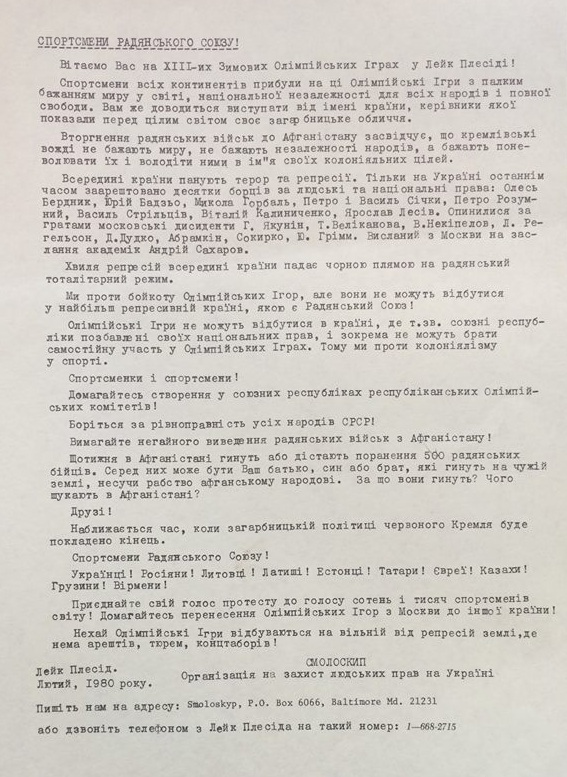 “Lake Placid, N.Y., XIII Winter Olympic Games (UIS ‘Smoloskyp’). On Monday, February 18 of this year, a press conference organized by Smoloskyp—the Organization for the Defense of Human Rights in Ukraine—took place here in the conference hall of the City Administration, at which Nina Strokata-Karavanska spoke on behalf of the Kyiv Ukrainian Helsinki Group.”